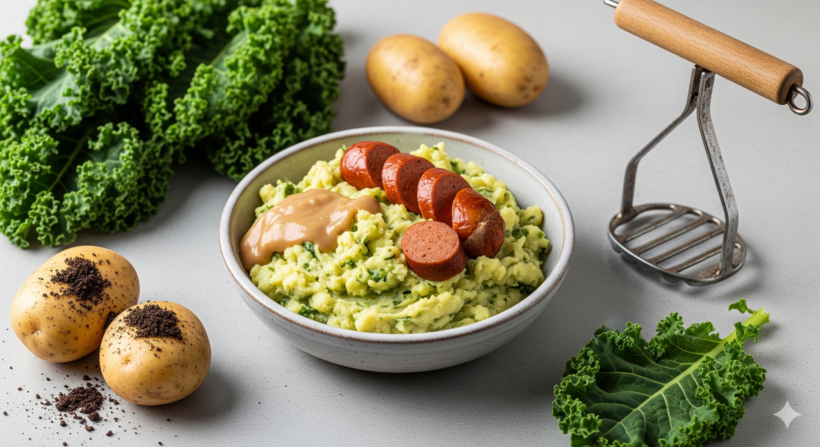 - Schep de stamppot op borden, maak een kuiltje en leg daar de rookworst in. Serveer met mosterd en een scheut jus.